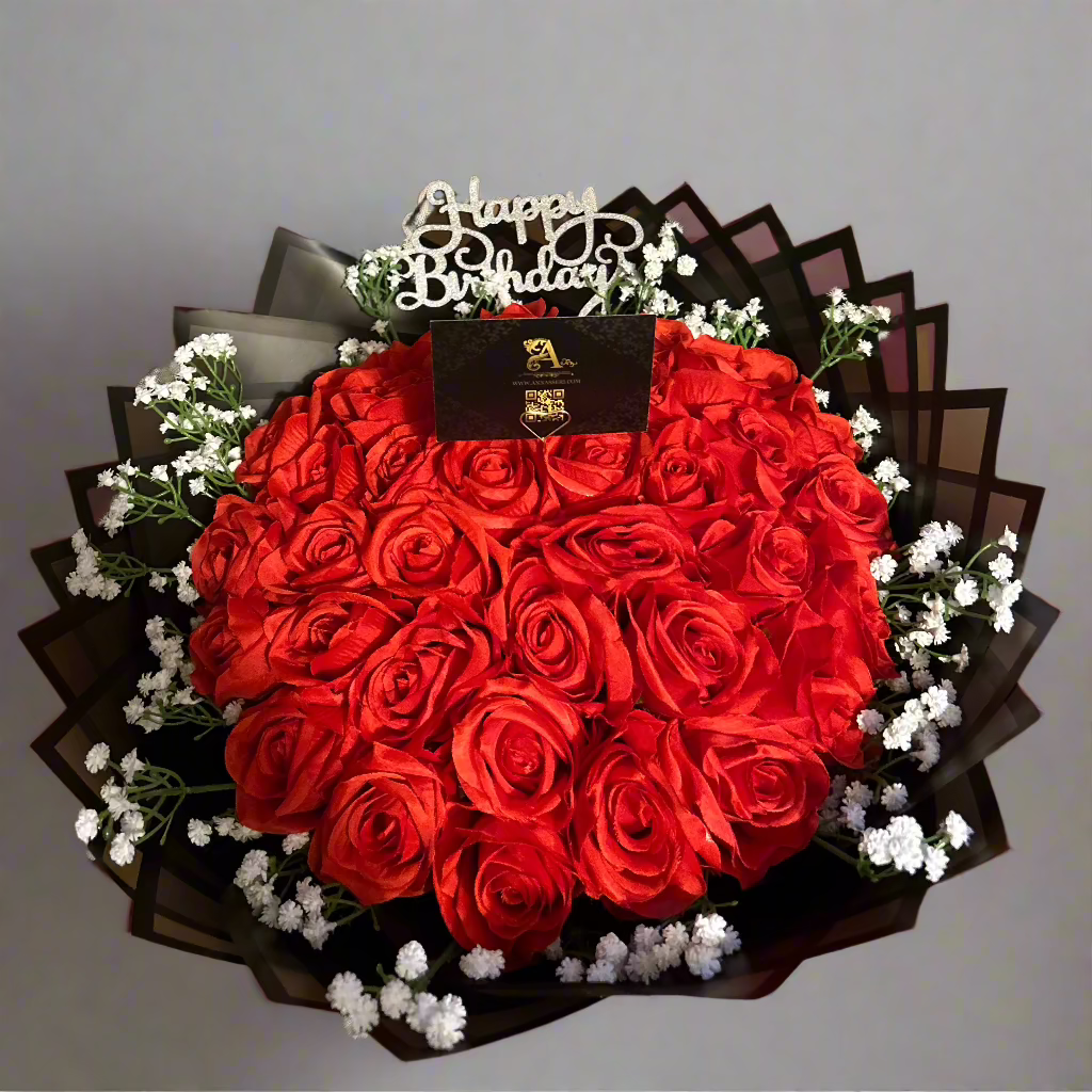 The bouquet is wrapped in stylish black paper with a slightly sheer finish, offering a contemporary and elegant presentation. This design highlights the vibrant colours of the blooms while giving a modern, mysterious flair to the overall look. Ideal for special occasions like anniversaries, birthdays, or as a statement of appreciation, this bouquet is sure to leave a lasting impression.